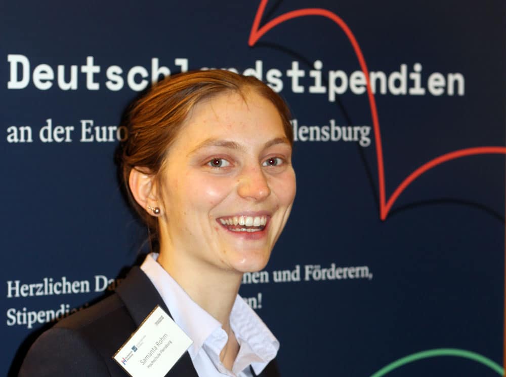 Samanta Rohm, Hochschule Flensburg, wissenschaftliche Mitarbeiterin, 2. Semester MA Systemtechnik: „Momentan unterstütze ich als wissenschaftliche Mitarbeiterin die Planung für die Energieversorgung des neuen Zentralklinikums. Mir wird das Deutschlandstipendium zum dritten Mal verliehen. Für meine Bachelorarbeit habe ich bereits den VR Bank-Preis erhalten. Dort ging es um die Kopplung einer Gas- und Dampfturbinenanlage mit dem Fernwärmenetz der Stadt Flensburg. Mein Traum ist, nach dem Masterstudium zu promovieren und nach einigen Berufsjahren in der Industrie als Dozentin an die Hochschule Flensburg zurückzukehren. Ein Thema, dass uns noch lange beschäftigen wird: Regenerative Energien – das habe ich hier studiert!“