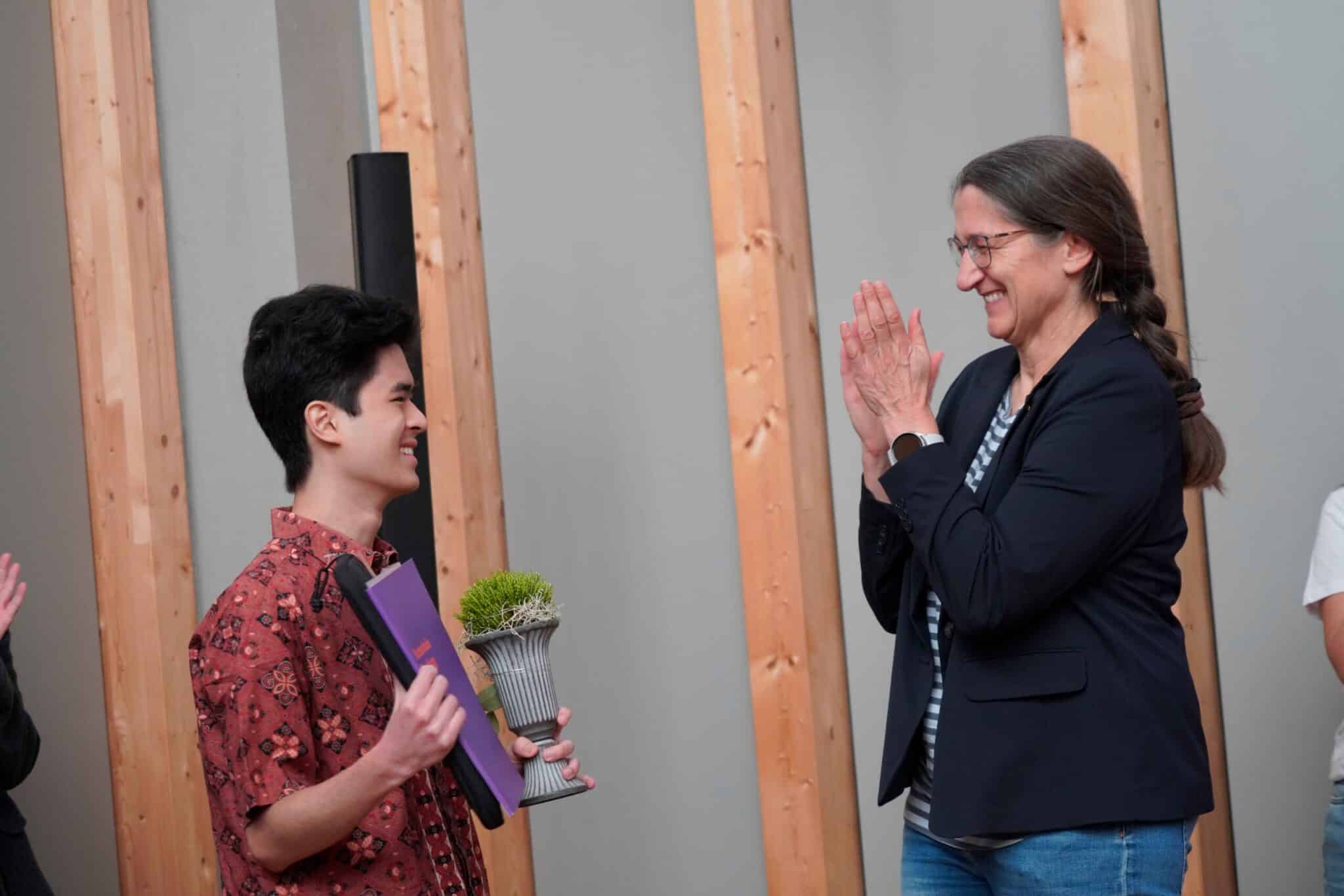 In ihrer Laudatio würdigte Prof. Dr. Brigitte Clausen, Vizepräsidentin für Forschung, Transfer und Nachhaltigkeit der Hochschule Flensburg, die Bedeutung des Tages und die herausragende Leistung des Preisträgers: „Der Intercultural and Diversity Day ist jedes Jahr ein besonderer Moment, um uns daran zu erinnern, was unseren Campus wirklich lebendig macht: die Vielfalt an Kulturen, Perspektiven und Erfahrungen, die uns alle bereichern.“ Mit Blick auf den Preisträger sagte sie weiter: „Farrel Kevin Gardjito verkörpert diese Werte in besonderer Weise. Seine Neugier, seine Hilfsbereitschaft und sein offenes Wesen sind ein Gewinn für unsere gesamte Gemeinschaft. Er erinnert uns daran, dass Internationalität nicht nur ein Wort auf dem Papier ist, sondern jeden Tag gelebt wird, wenn wir voneinander lernen.“