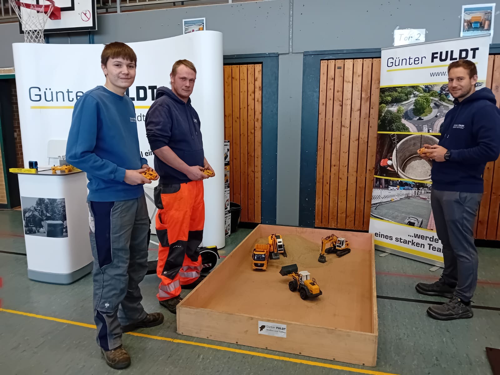 Vertreten war in diesem Jahr unter anderem der ortsansässige Familienbetrieb in dritter Generation Günter Fuldt Straßen und Tiefbau GmbH & Co. KG. Am Stand informierten Azubi Patrick, Devin, Tiefbaufacharbeiter mit Schwerpunkt Straßenbau, und Yanik, Ausbildungsleiter und Straßenbaumeister, die Schülerinnen und Schüler über Berufe wie den des Tiefbaufacharbeiters. Mit ferngesteuerten Baggern lenkten sie die Blicke auf der Schacht-Audorfer Berufsmesse auf ihren Stand. Trotz der Spielereien lag der Fokus aber vor allem auf den Gesprächen – für die Aussteller ein großer Erfolg, denn sie suchen neue Auszubildende aus der Region.